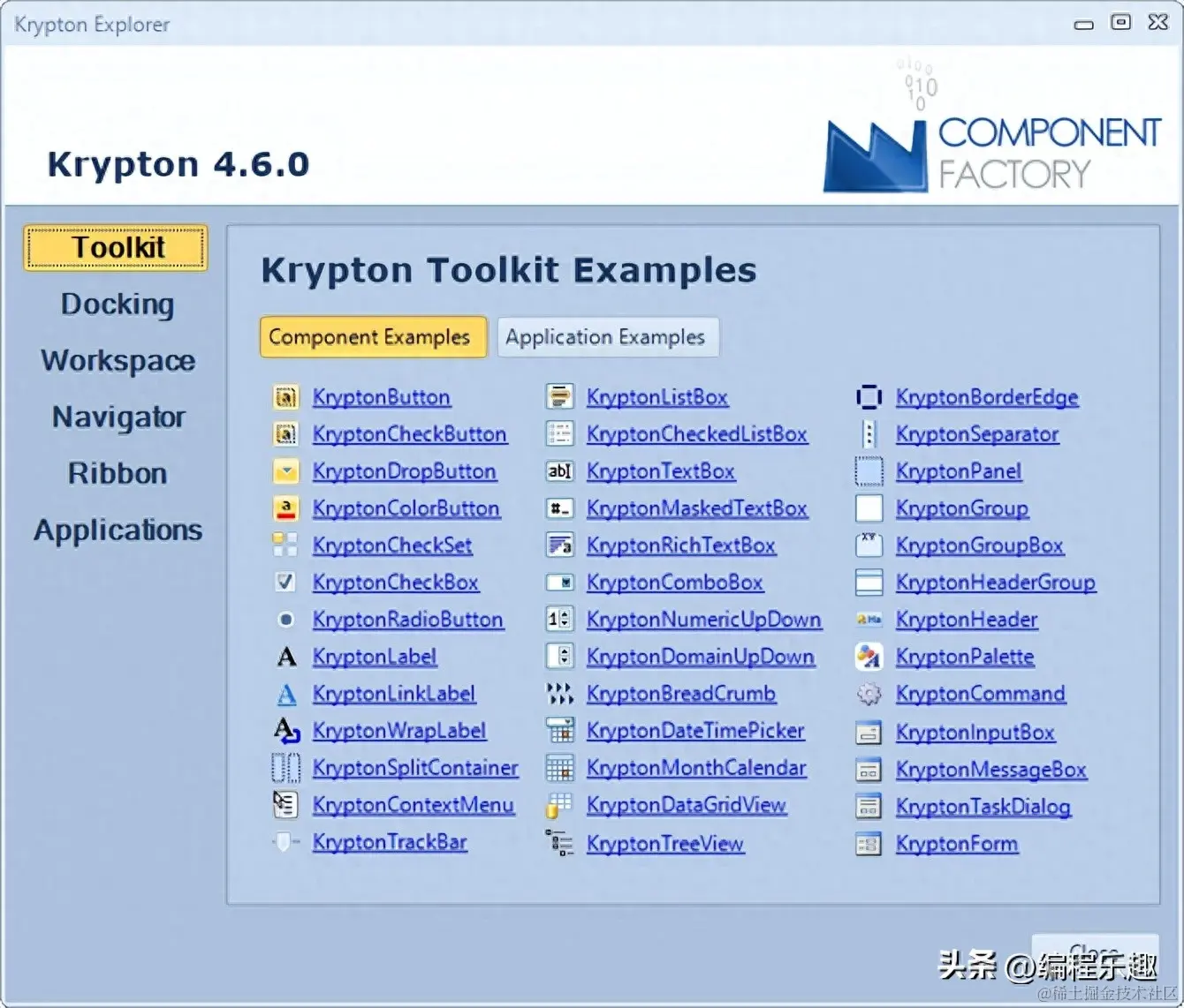 Krypton是一套开源的.Net组件,用于快速构建具有丰富UI交互的WinForms应用程序。丰富的UI控件,提供了48个基础控件,如按钮、文本框、标签、下拉菜单、树形控件、表格控件等等。还支持自定义主题,这使得开发者可以根据自己的需求,来定制应用程序的UI风格,提高用户体验。