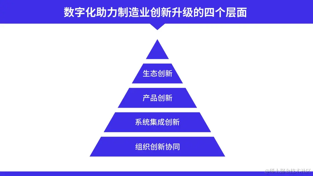 中国工程院院士周济曾提出,制造业数字化转型有4层内涵:产品创新、生产技术创新、产业模式创新、制造系统集成创新。
