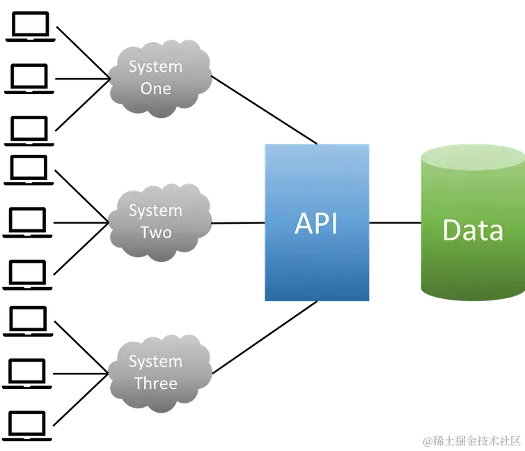 在这种图中,API通常被表现为一个中心的方框,而与其互动的各种外部系统和服务则以各种形状围绕着它。有方框,有圆圈,还有其他的形状。