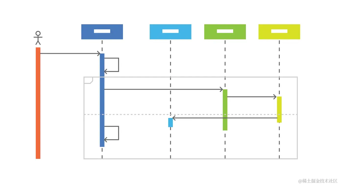 在序列图中,API 的不同组件表示为框或对象,它们之间的交互表示为跨泳道的箭头或线条。
