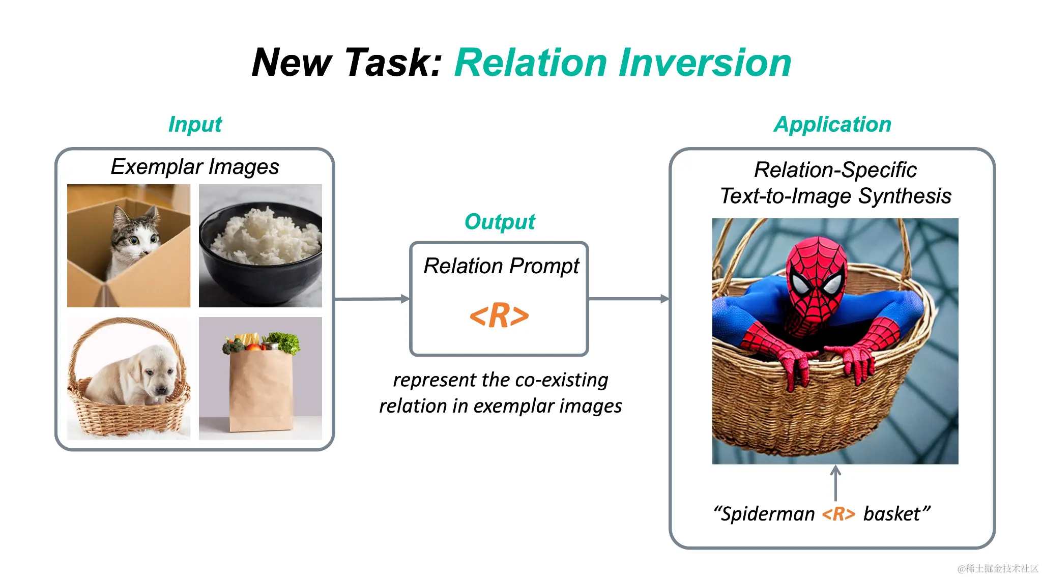 如上图,给定几张参考图片,这些参考图片中有一个共存的relation,例如“物体A被装在物体B中”,Relation Inversion的目标是找到一个relation prompt 来描述这种交互关系,并将其应用于生成新的场景,让其中的物体也按照这个relation互动,例如将蜘蛛侠装进篮子里。
