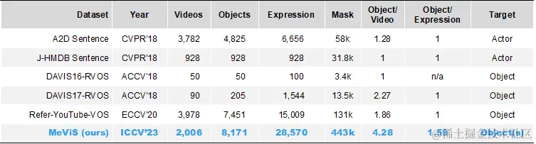 MeViS包含共2,006个视频,对视频集中的8,171个物体提供了总共28,570个自然描述语句。从下表中可以看出,MeViS在自然语句数量、物体数量、Mask规模等方面显著超越其他数据集。