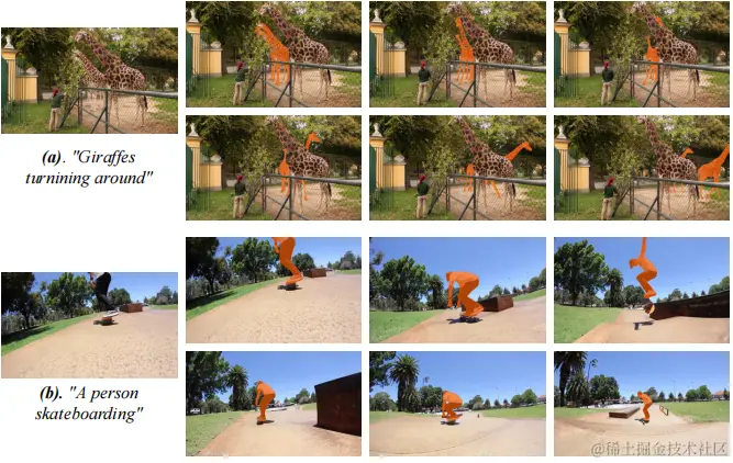 图3 MeViS (a)和Refer-YouTube-VOS (b)在动态描述上的对。 MeViS句子所描述的物体“那些转身的长颈鹿”需要观察一段视频才能找到,Refer-YouTube-VOS由于视频难度的原因,即使提供了动态描述,也可以通过类别名称,如“人”,在单帧图像中找到。