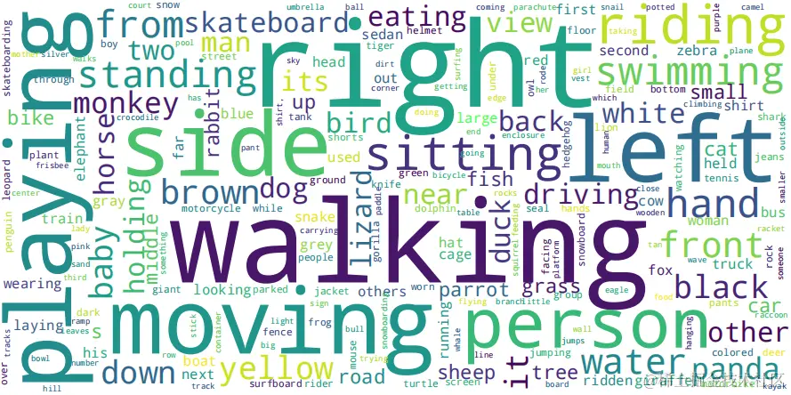 图 2 MeViS中包含大量描述动态属性的单词,如walking, moving, playing等