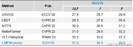如下为MeViS数据集Val部分目前的benchmark结果。最优结果仅为37.2%,这表明仍存在巨大的发展和研究空间。