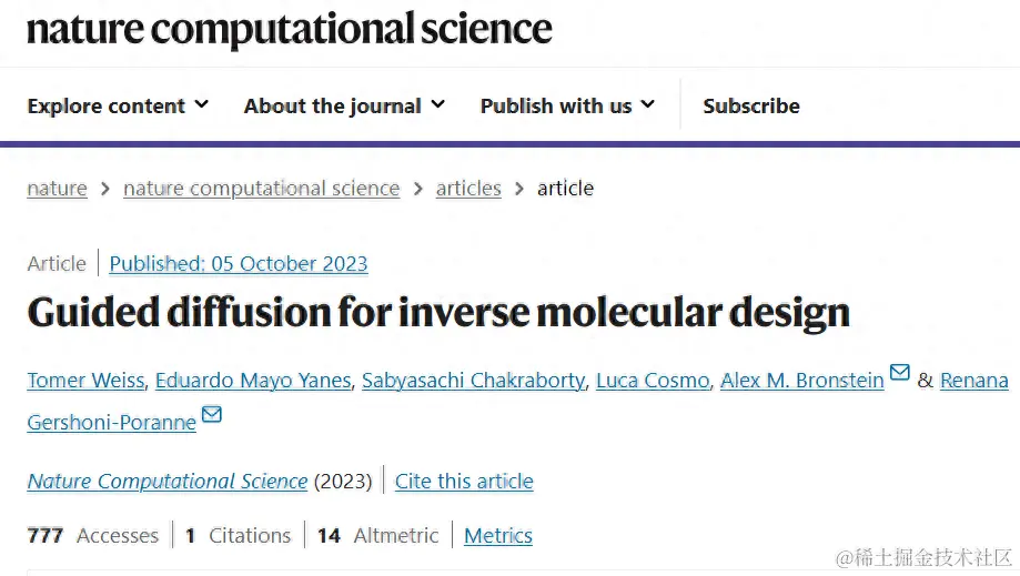 该研究以「Guided diffusion for inverse molecular design」为题,于 2023 年 10 月 5 日发布在《Nature Computational Science》上。