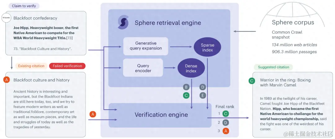它的行为是通过维基百科本身来学习的:使用精心策划的英语维基百科声明及其当前引用的语料库,研究人员训练(1)一个检索器组件,将声明和上下文转换为经过优化的符号和神经搜索查询,以在网络规模的语料库中查找候选引用;(2) 一个验证模型,根据现有的和检索到的引文验证给定声明的可能性进行排名。