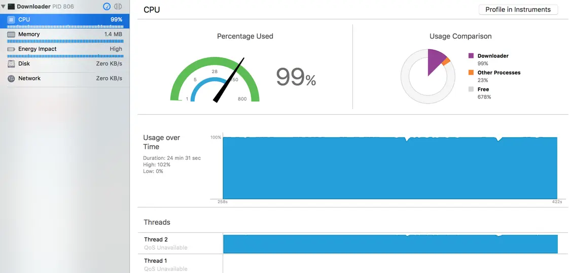 可以看到,在没有新的用户输入到达,且消息队列中没有需要处理的任务时,整个应用程序没有持续的霸占 CPU 资源,这就归功于 RunLoop。