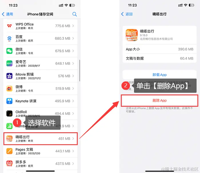 步骤3:点击软件,可以查看软件以及其缓存数据的占比大小,挑选好软件后,然后点击下方的【删除APP】按钮即可。