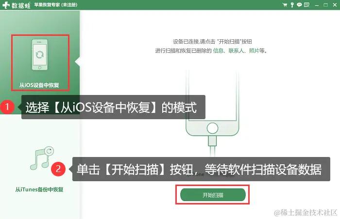 步骤2:连接成功后,点击【从iOS设备中恢复】模式,紧接着单击【开始扫描】按钮。