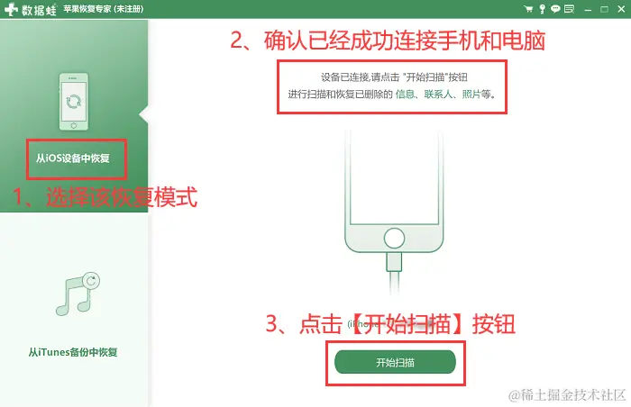 步骤2:默认选择【从iOS设备中恢复】模式,然后点击【开始扫描】按钮。完成该操作后,软件将会对您的手机进行全方位的扫描。