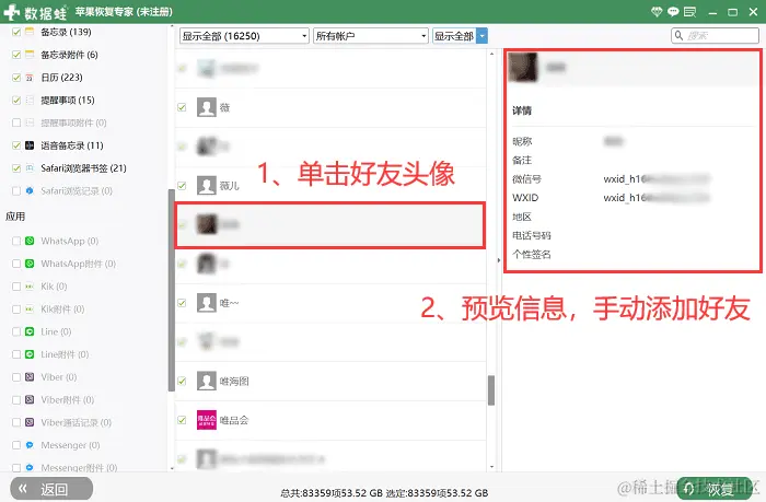 步骤3:数据扫描分析完毕后,在左侧菜单栏中可以看到很多数据,找到并选择【微信通讯录】,然后在联系人列表中找到被删除的好友,点击其头像在右侧预览对方信息。最后复制对方的微信账号,返回微信进行添加即可。