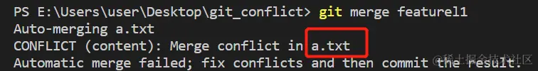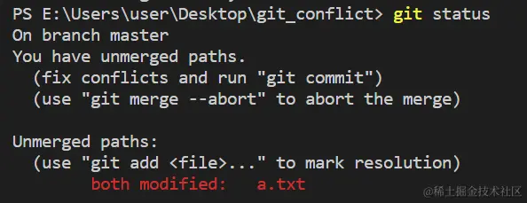从冲突信息可以看到,a.txt发生冲突,必须手动解决冲突之后再提交