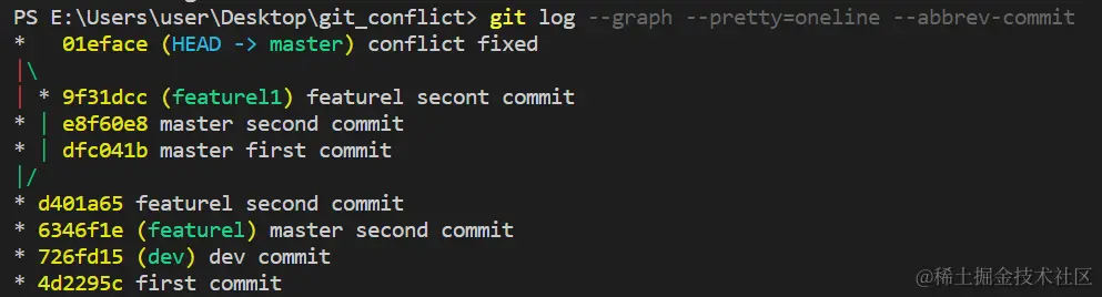 此时a.txt文件的内容变成featurel commit,没有出现冲突情况,这是因为git在内部发生了快速合并