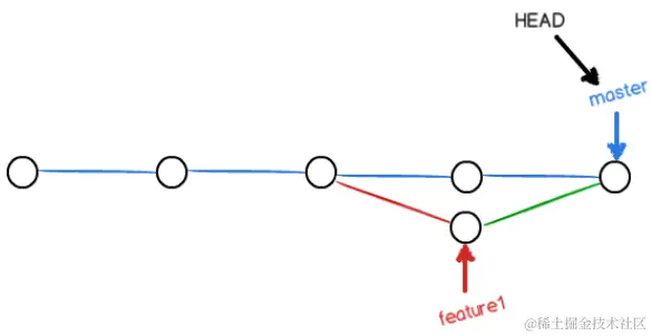 此时,master分支和feature1分支各自都分别有新的提交,变成了下图所示: