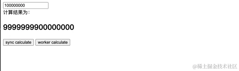 - worker按钮:主线程执行一次耗时任务,worker线程执行一次,展示二者之和,得到计算时间workerCost