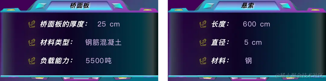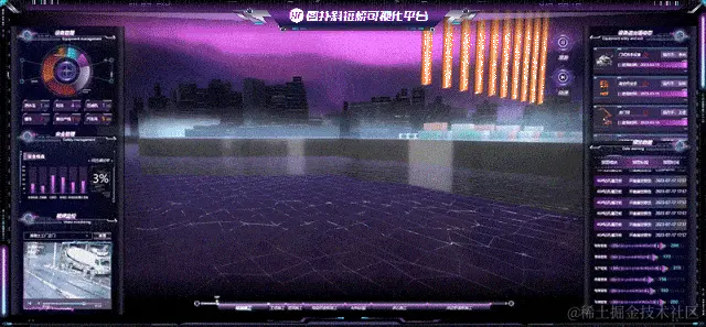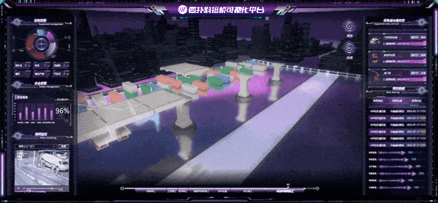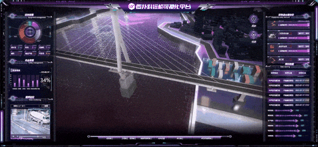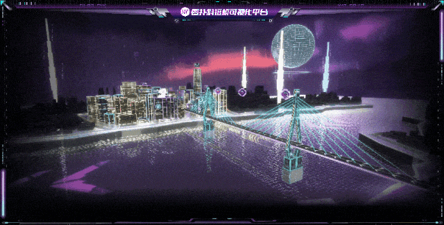 图扑软件基于自主研发的 HT for Web 产品,利用现场照片及 CAD 图纸,结合 PBR 材质,搭建了具有赛博朋克风格的智慧斜拉桥可视化解决方案,精准复现斜拉桥建造规划过程,辅助运维人员对桥梁基建过程的网格化管理。提高桥梁的建设效率和安全性能,达到优化设计方案,方便施工现场管理和提高桥梁运营效率等多个目的。