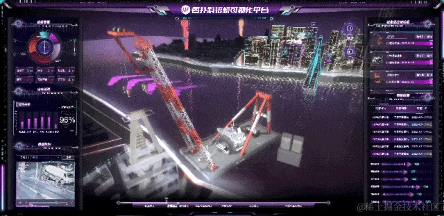 - 然后,进行桥梁预制板的制作和安装。针对该步骤,图扑软件应用自主研发 HT for Web 渲染引擎,着重孪生了浮船吊机牵引桥体面板进行吊装,以及通过滑行车将两段桥面板衔接处进行固定的全过程。丝丝入扣的动画效果,有助于作业人员直观查看吊机的负荷、桥体面板位置的衔接及固定的准确性。
