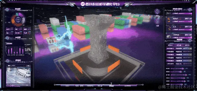 场景围绕“工作状态”、“运行状态”、”业务动画”几个方面进行多维度信息展示。图扑软件基于车辆、工厂、承台施工地内布设的传感装置,实现在 3D 可视化平台内,实时监测混凝土及钢筋车辆从其相应的工厂出发抵达承台施工地进行实施的行进工况。作业人员可根据大屏上的引导信息做出布局施工规划、班序计划调整等业务决策,辅助高效优化施工计划和方案。