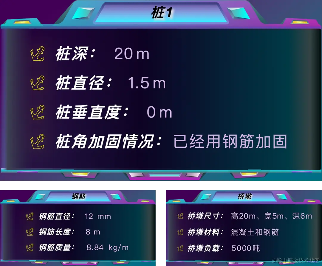 - 首先,将预制深水桩通过打桩机打入海中。与此同时,左侧 2D 面板内用以 HT 丰富的图表组件展示深水桩桩深、高、宽等数据信息。