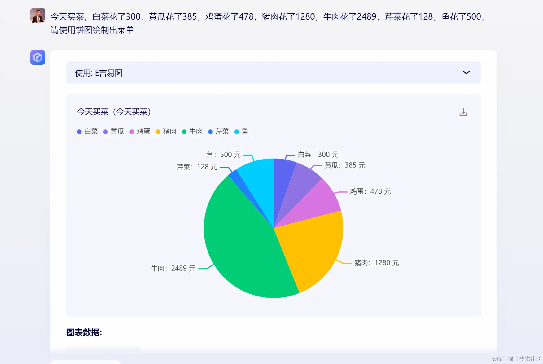 我们使用AI工具帮我们完成一些高逼格的事,我让AI给我用饼图生成我我的菜单,它就帮我们生成了一个饼图,上面清晰地展示出了各种事物的占比。