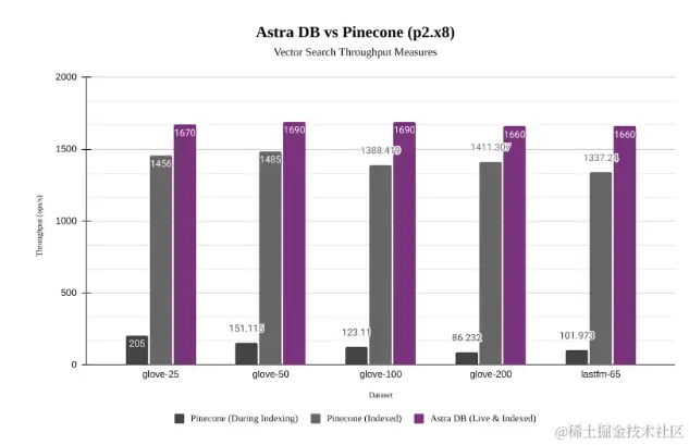 虽然 Astra DB 的静态数据集比 Pinecone 快大约10%,但在同时索引新数据时,它的速度是 Pinecone 的8到15倍。