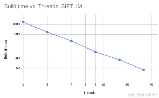 这张图在 x 轴和 y 轴上都是对数刻度,显示加倍线程数可以将构建时间减半。