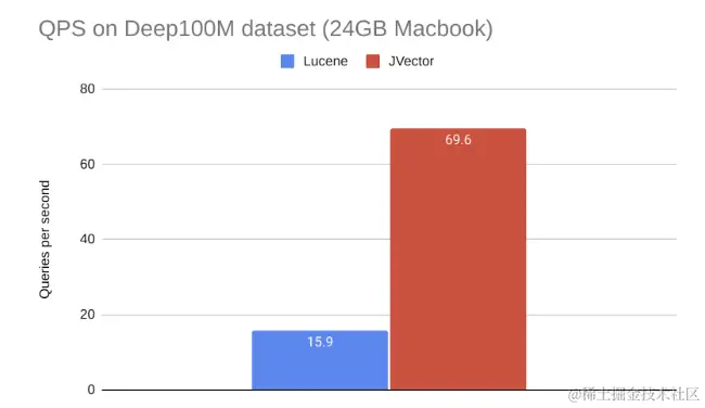 以下是在没有客户端/服务器组件的纯嵌入式场景下的 HNSW 与 DiskANN 的对比。这测量了在 Lucene(HNSW)和 JVector(DiskANN)下搜索 Deep100M 数据集的速度。Lucene 索引是55GB,包括索引和原始向量。JVector 索引是64GB。搜索是在我的24GB MacBook上进行的,其内存约为索引RAM大小的三分之一。