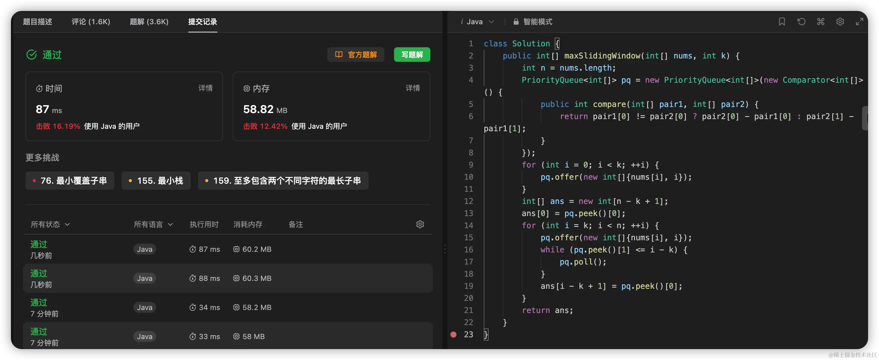 - 时间复杂度:O(nlogn),其中 n 是数组 nums 的长度。在最坏情况下,数组 nums 中的元素单调递增,那么最终优先队列中包含了所有元素,没有元素被移除。由于将一个元素放入优先队列的时间复杂度为 O(logn),因此总时间复杂度为 O(nlogn)