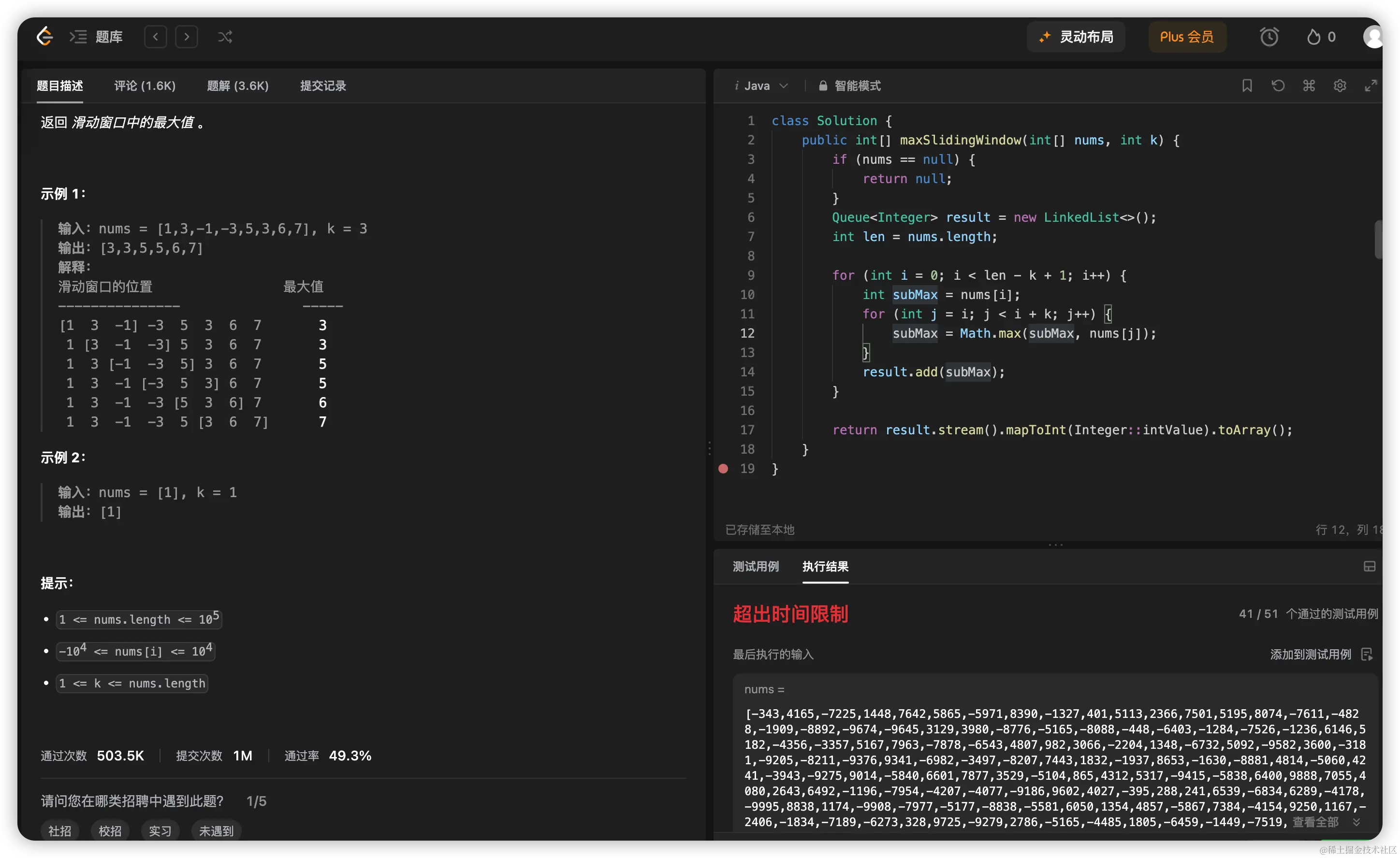 - 时间复杂度:O(nk),其中 n 是数组 nums 的长度,k是窗口长度,嵌套了两层for循环。