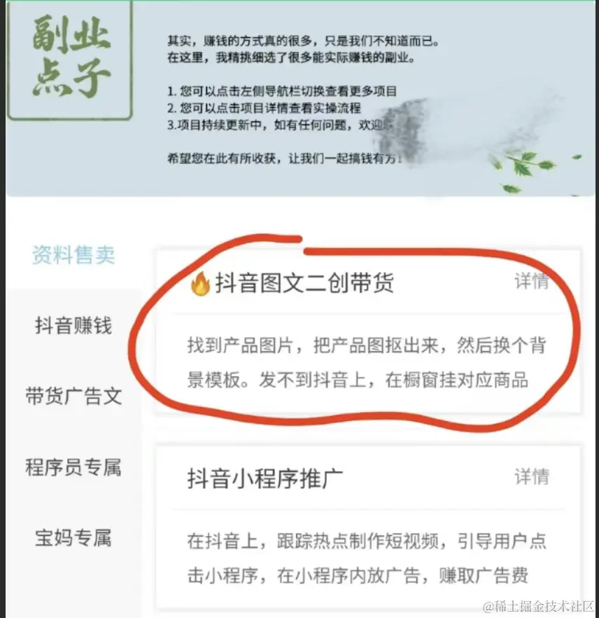 2、从自身需求出发,把自己都做产品的用户,最了解自己的需求是是什么,需要什么功能,市场有什么服务。比如我的知识星球,就是因为作为程序员的我,在探索副业的时候,发现自己在 点子/技能/认知/项目/实战 这些方面都很欠缺,因此,我干脆弄了个星球来沉淀这些内容,也服务于其他程序员。
