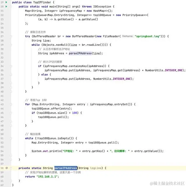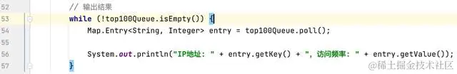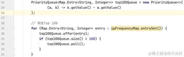 一旦我们统计完所有的IP访问频率,接下来就是要找出访问频率最高的Top 100个IP地址。为了实现这一点,我们可以使用优先队列(PriorityQueue)来帮助我们保持前100个最高频率的IP地址。