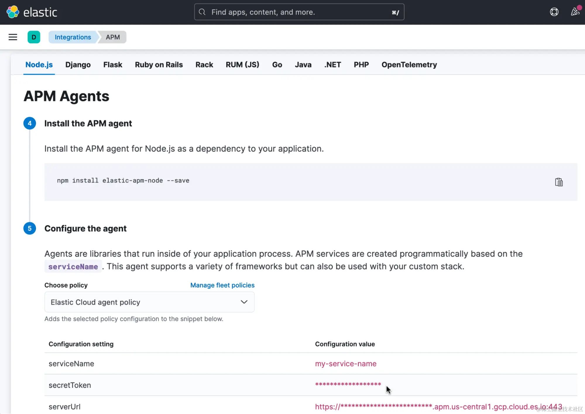 在 APM 代理页面上,复制 SecretToken 和 serverUrl 值并保存它们以供后续步骤使用。