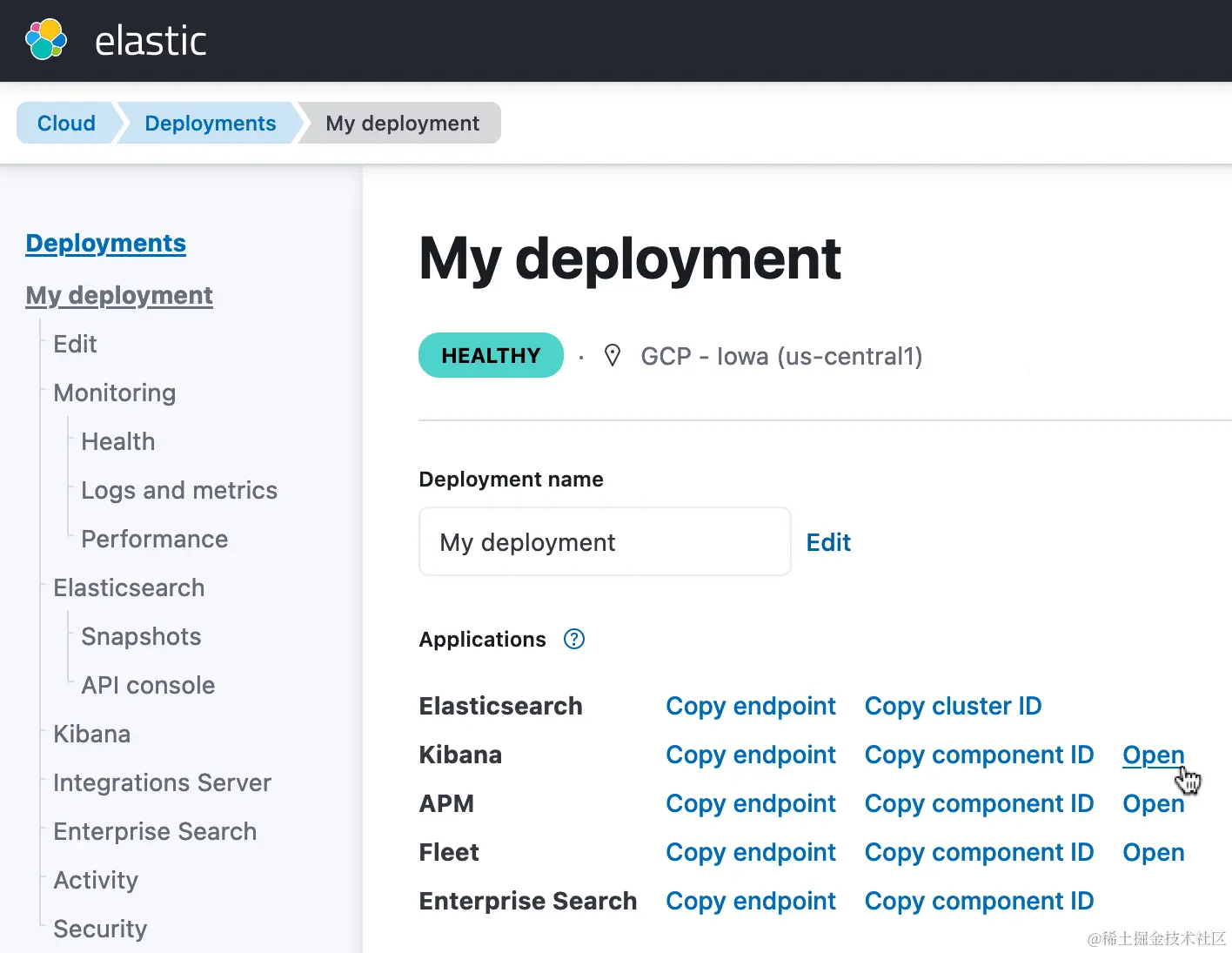 要复制 APM 服务器 URL 和 APM 秘密 token,请转到 Elastic Cloud 。 然后转到 “Deployment” 页面,其中列出了你已创建的所有部署。 选择你要使用的部署,这将打开部署详细信息页面。 在 Kibana 链接行中,单击 Open 以打开 Kibana® 进行部署。