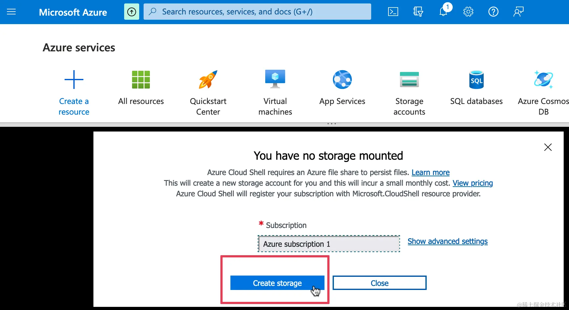 - 如果系统提示你 “You have no storage mounted”,请单击 Create storage 按钮创建一个文件存储,用于从 Cloud Shell 保存和编辑文件。
