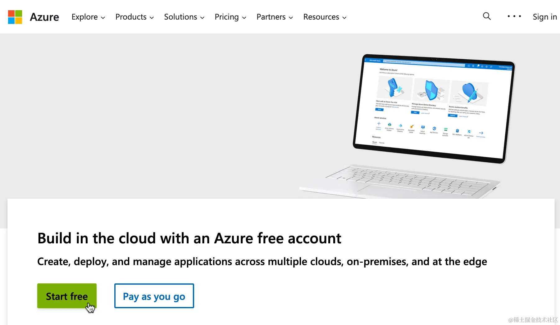 首先,我们需要一个 Azure 帐户,因此让我们通过转到 Microsoft Azure 门户并创建一个新项目来创建一个帐户。 单击 “Start free” 按钮,然后按照步骤登录或创建新帐户。
