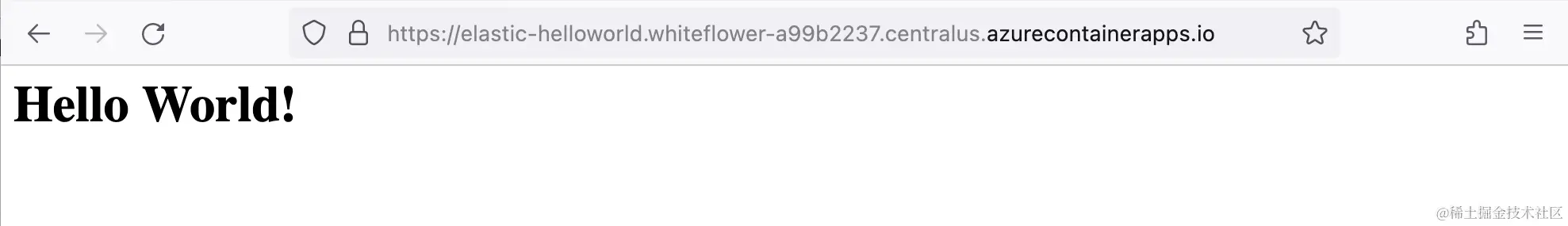 此命令将输出已部署的 Hello World 应用程序的完全限定域名 (FQDN)。 将 FQDN 复制并粘贴到浏览器中以查看正在运行的 Hello World 应用程序。