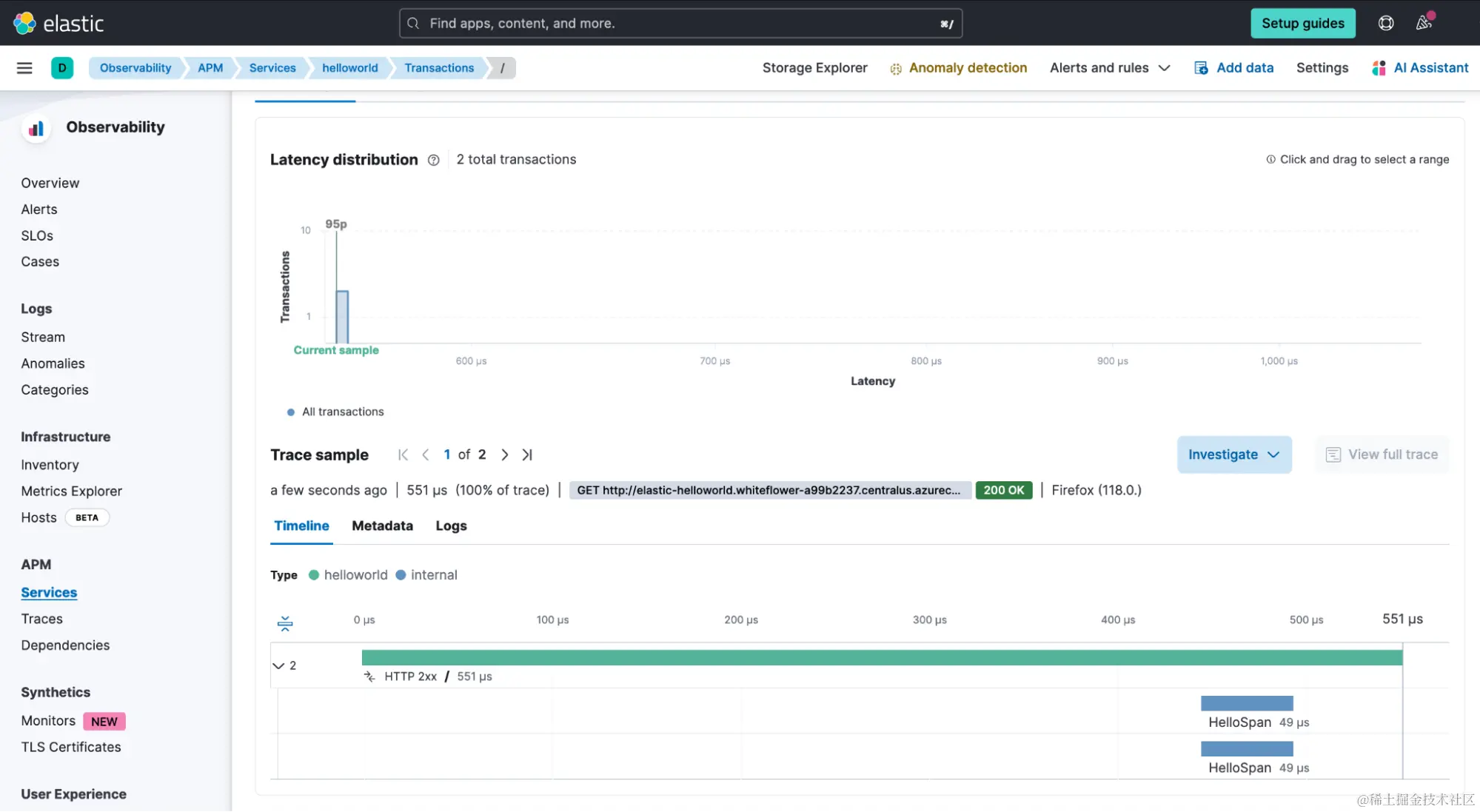 - 向下滚动并单击 GET / transaction。向下滚动到 Trace Sample 部分以查看 GET /、HelloSpan 跟踪示例。