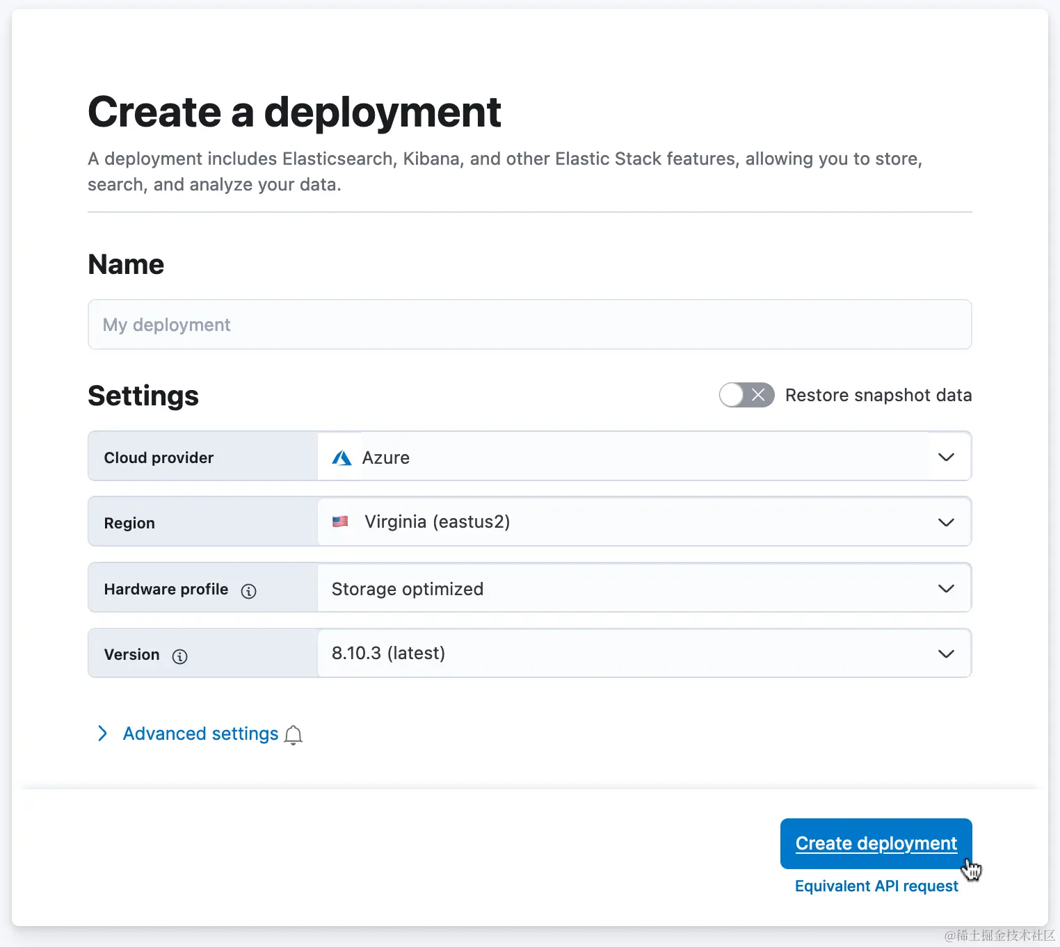 从 Elastic Cloud 控制台中,选择 Create deployment。