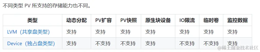 需要注意的是:独占盘类型的 PV 不支持 PV 扩容、PV 快照等操作。