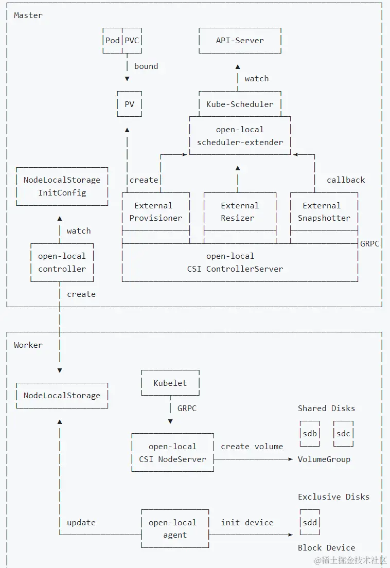他们单个都不满足我们的需求,我们需要的是既可以使用pv/pvc这种方式集中管理磁盘,也想有本地磁盘的速度。 针对以上问题,open-local就比较符合我们的需求。相当于是二者的集合