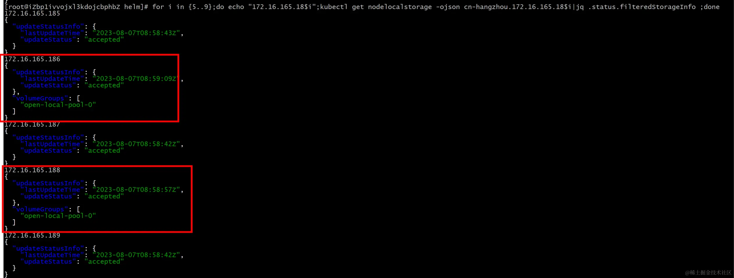 for i in {5..9};do echo "172.16.165.18$i";kubectl get nodelocalstorage -ojson cn-hangzhou.172.16.165.18$i|jq .status.filteredStorageInfo ;done