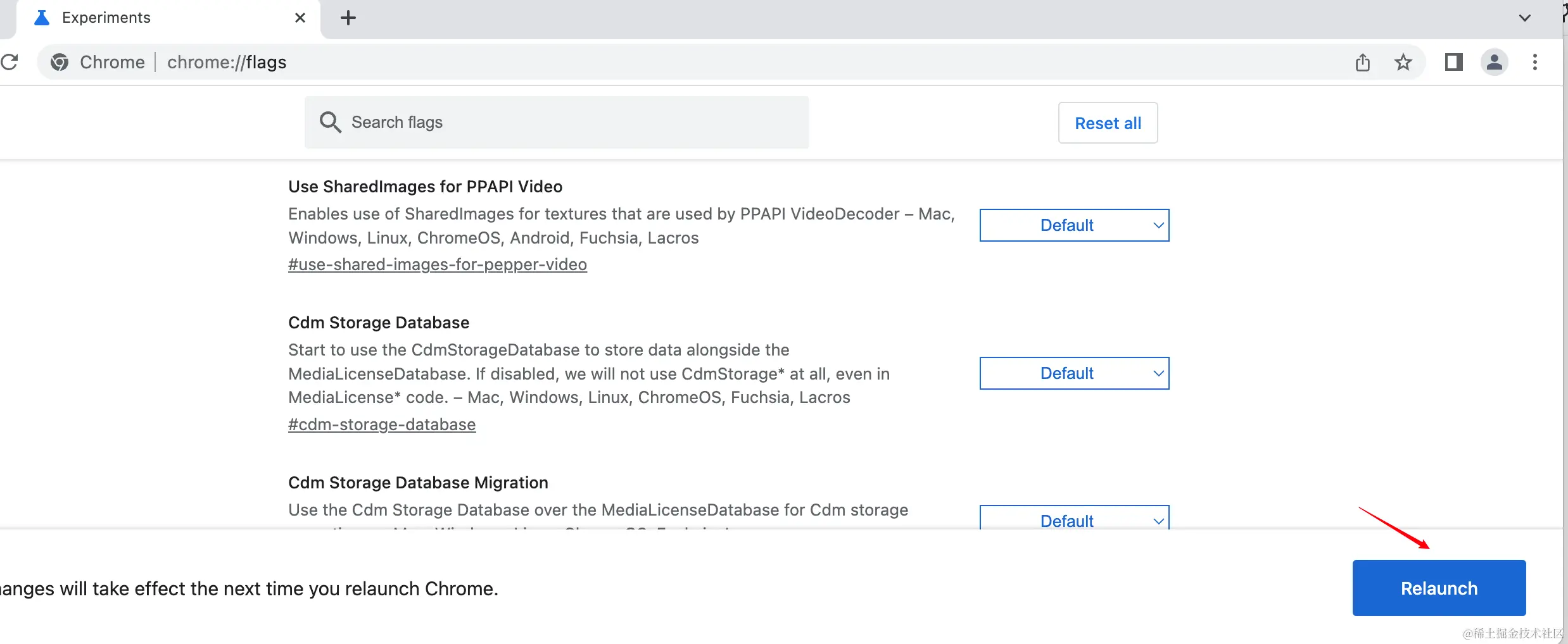 注意在chrome://flags/中更改完配置后,需要点击Relaunch按钮更新下才能生效。