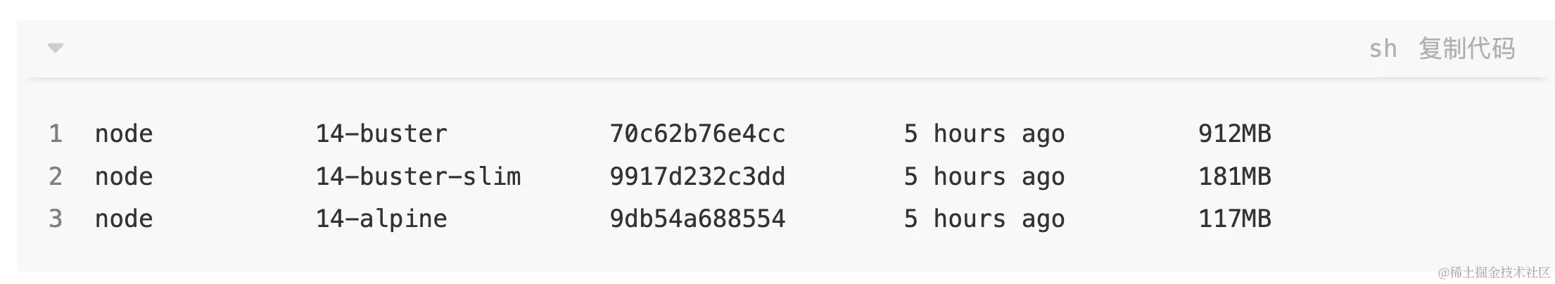 针对DockerFile中From的基础镜像,可以从DockerHub查询,如本项目中使用的是node:14.21.3-alpine。考虑到不同node版本体积的大小(如下图),这里采用
