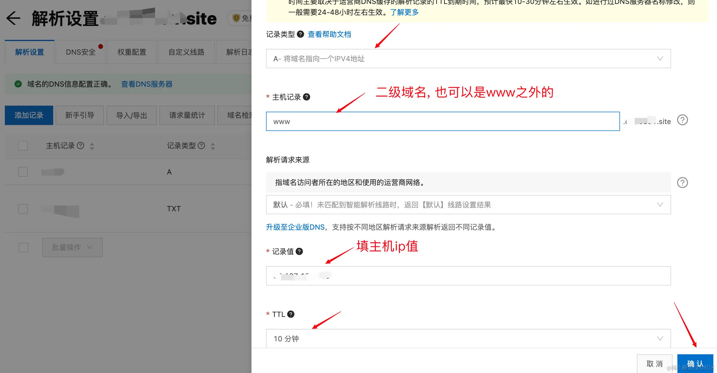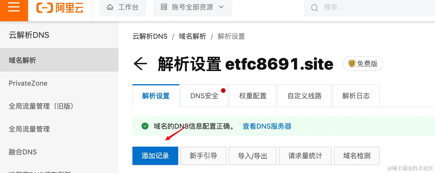 配置DNS的流程如下图所示,点击解析按钮跳转到 云解析DNS/域名解析/解析设置,添加ipv4的记录: