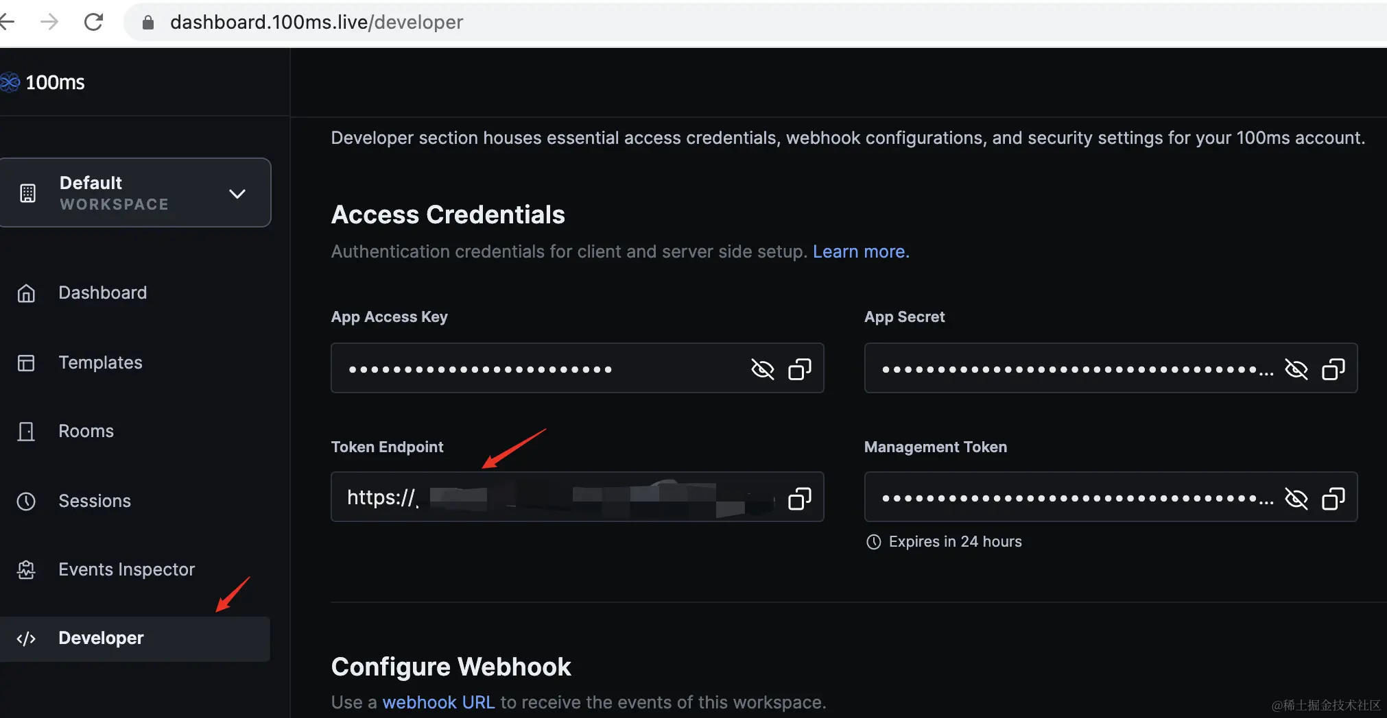 从源码来看,请求token的URL对应.env.local中的变量NEXT_PUBLIC_HMS_TOKEN_ENDPOINT(也是前面所述的部署Vercel成功后的获取配置值中的一个),该URL对应着平台上的Token Endpoint如下图 。