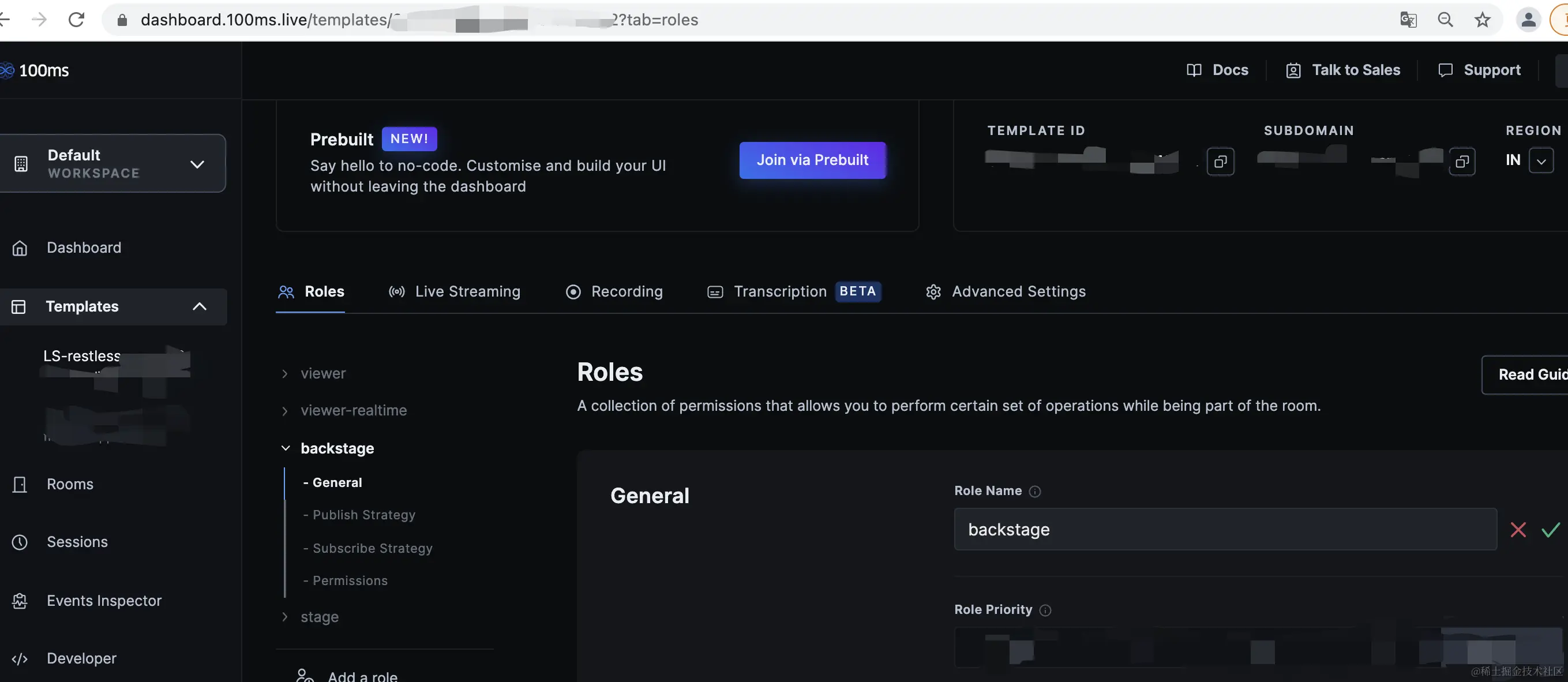 开发者可以按照Templates and Roles、HMS的readme中的指引设置正确的Template和Roles,项目中需要正确设置的Roles有viewer对应/stage/a、stage对应/stage/a?role=stage、backstage对应/stage/a?role=backstage见项目原代码components/hms/Room.tsx、components/hms/lib/getToken.ts,不同的Roles对应不同的使用者权限,其设置如下图: