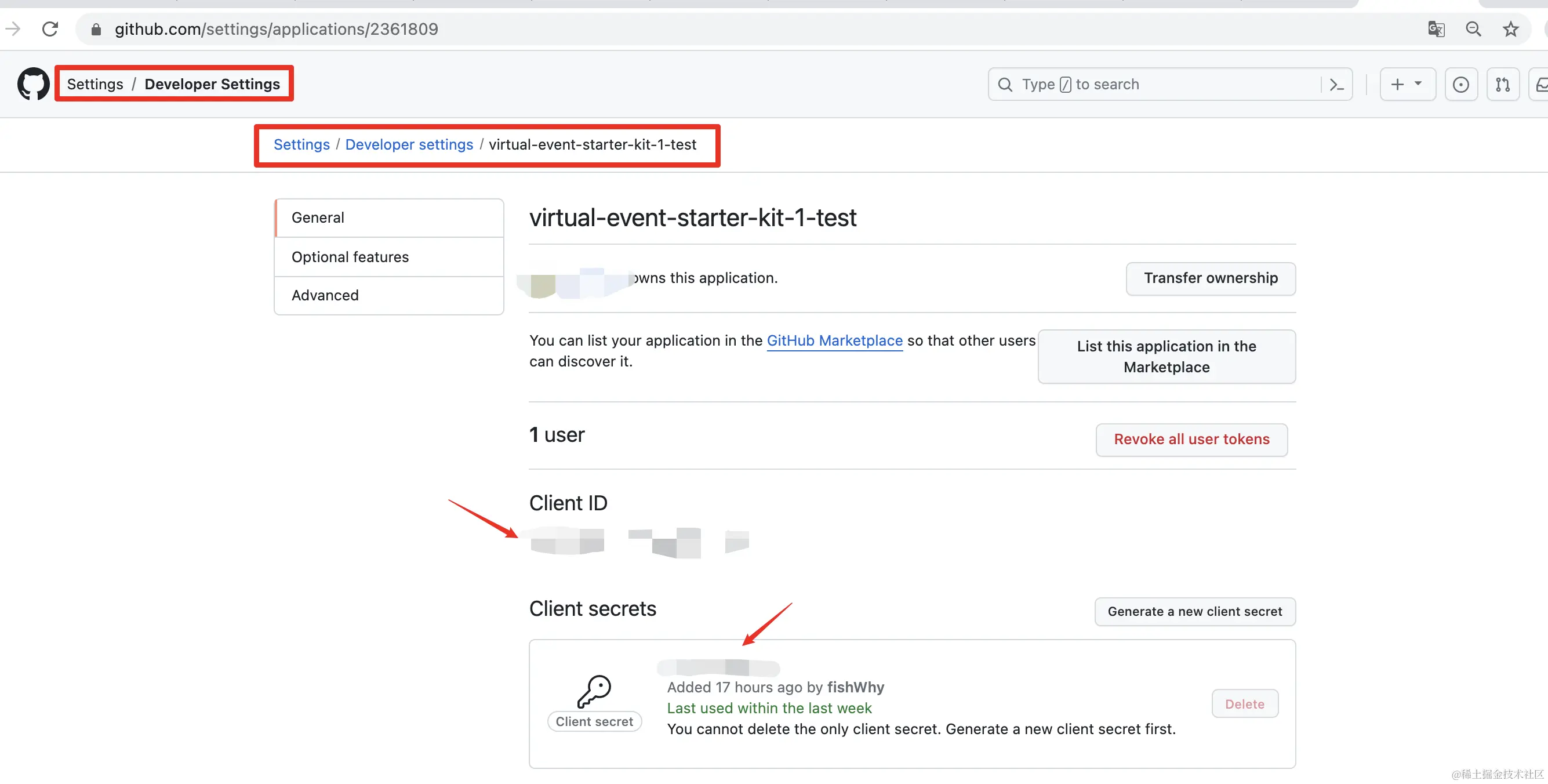 如下图所示位置,可以获取到到ClientID、ClientSecret分别赋值给.env.local中的NEXT_PUBLIC_GITHUB_OAUTH_CLIENT_ID、GITHUB_OAUTH_CLIENT_SECRET变量。