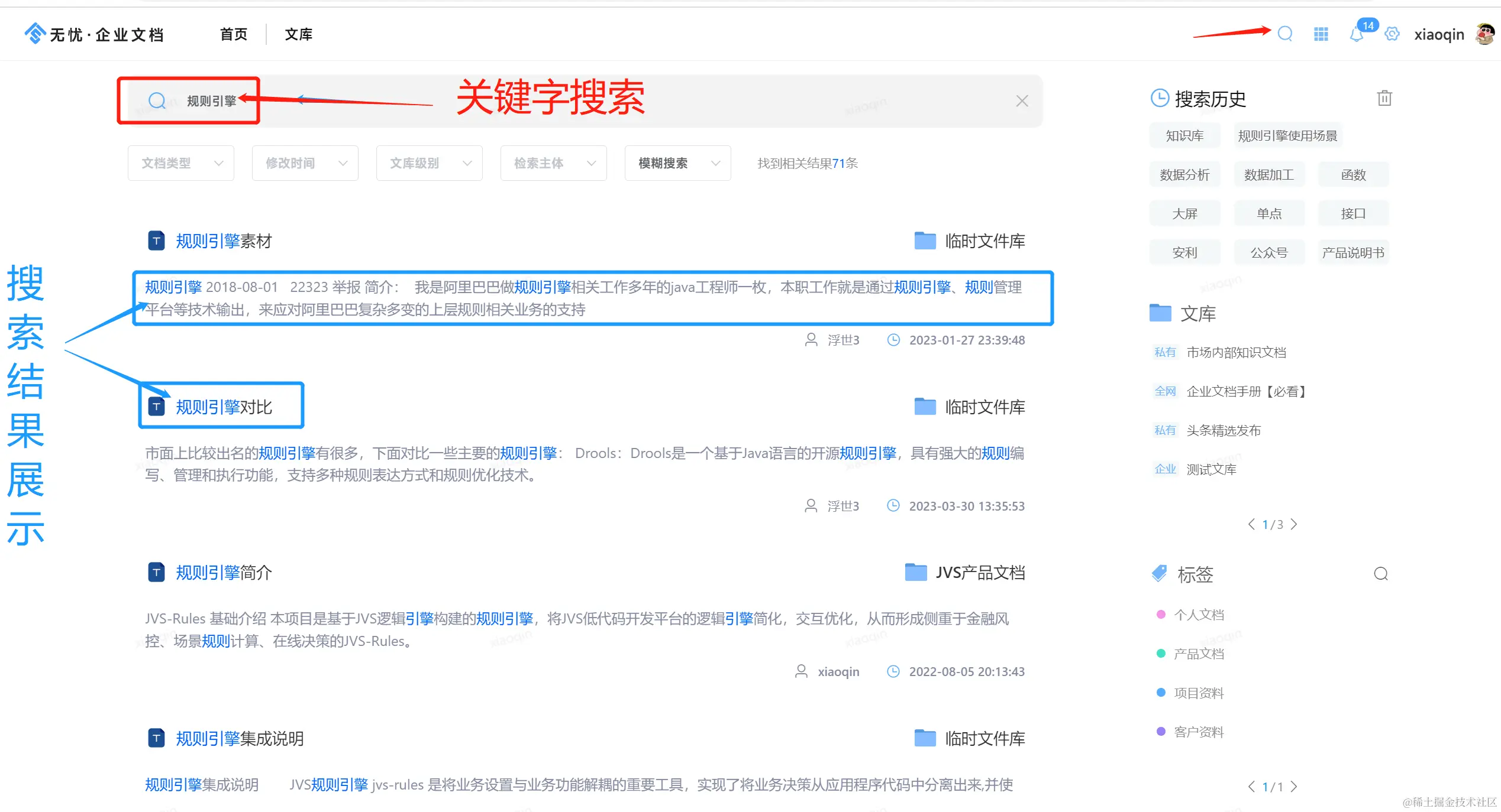 6、方便的全站检索:无忧企业文档提供企业级搜索引擎,通过关键字快速搜索权限以内的内容标题及内容。