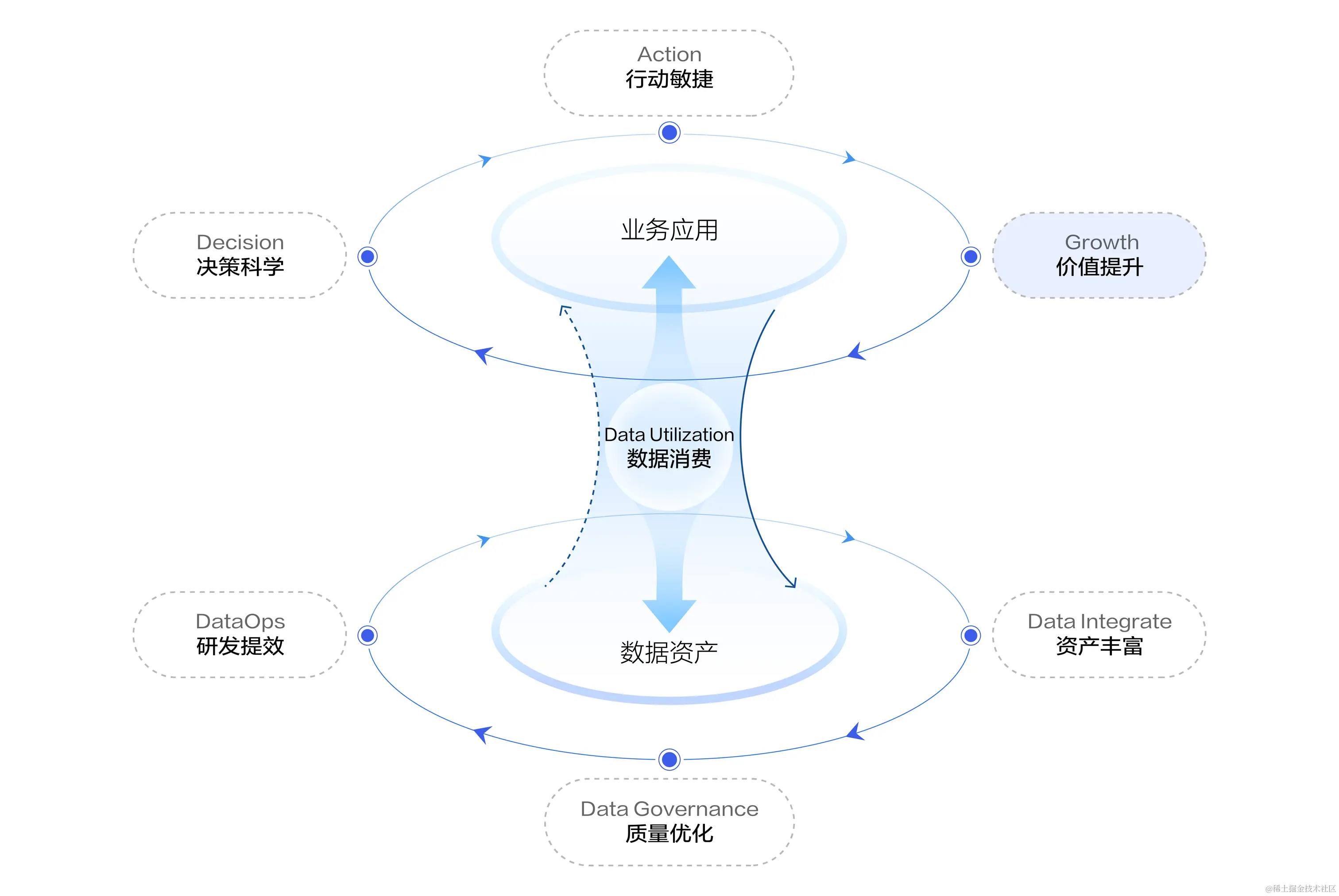 数据飞轮是基于字节跳动十余年数据驱动实践经验提炼的企业数智化升级新范式,数据飞轮以数据消费为核心驱动,能够帮助企业数据流充分融入业务流,实现数据资产和业务应用相互促进飞轮效应,从而激发员工创造力,增强业务发展动力,提升组织生命力”。
